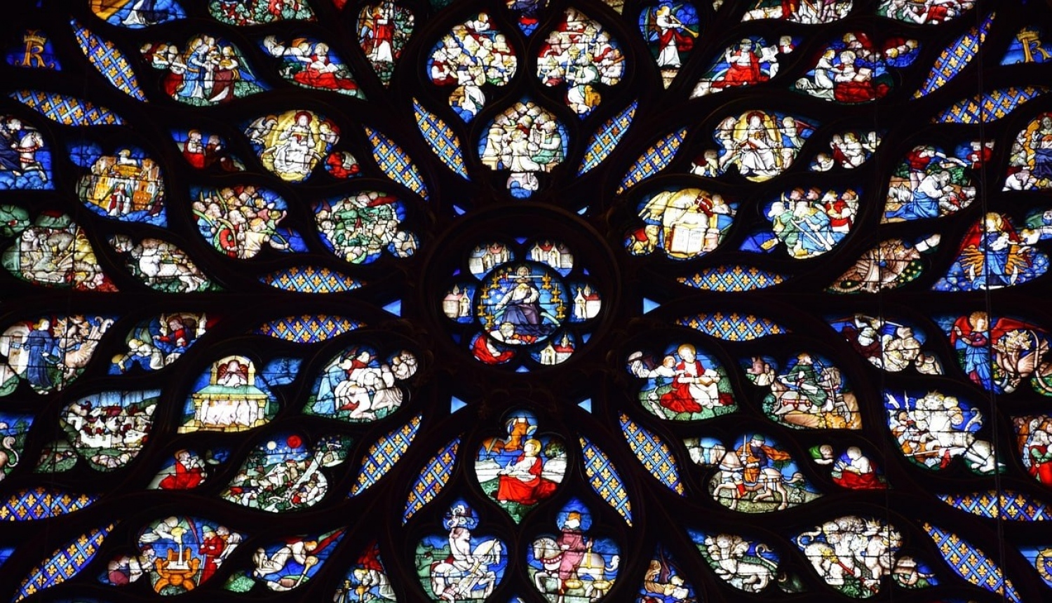 Le vetrate, in gran parte originali, raccontano in oltre 1.113 scene la storia dell'umanità, dalla Genesi all'Apocalisse (raffigurata nel rosone quattrocentesco), facendone un vero e proprio libro illustrato della Bibbia.